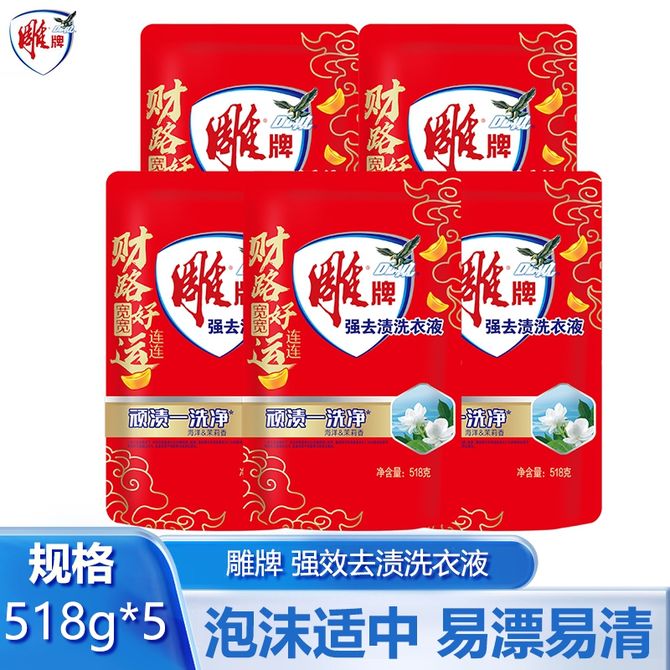 雕牌 强效去渍洗衣液518g*5袋 除菌不伤手易漂易洗衣物洁净去污 强力去渍配方有效去除污渍 衣物洗后白衣洁白彩衣鲜艳 兑换价格 1700 里程 会员卡别 终身白金卡 白金卡 金卡 银卡 普通卡 儿童卡 服务 由 广西北部湾网络科技有限公司 发货并提供售后 净含量: 其他容量 清洁剂容量: 其他容量 购买数量: 件 库存件 配送地址: 立即购买 加入购物车 成功添加到购物车 关闭 购物车共有 种商品 总金额为: 组合销售 产品介绍 产品规格 售后服务 产品咨询 发现好货 蓝月亮 深层洁净洗衣液4斤 1kgx1瓶+500gx2补充装 薰衣草香 强效去渍 1500 里程 威露士/Walch La有氧洗洗衣液套装 4斤松木清香(瓶1L+袋500ml*2) 除菌除螨 1900 里程 威露士 洗衣液除菌机洗手洗家用除螨去污1L*1瓶 1500 里程 蓝月亮 亮白增艳洗衣液2斤 1kg*1瓶 1100 里程 蓝月亮 护理洗衣液去污去渍 保护衣物纤维和原色 薰衣草香 1kg*2瓶 持久留香 速溶易漂 温和配方 1500 里程