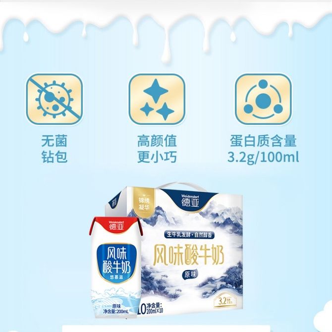 德亚/Weidendorf 锦绣凝华风味酸牛奶原味200ml*10礼盒 营养早餐奶 蛋白质含量3.2g,营养轻负担,大人小孩皆宜 兑换价格 2400 里程 会员卡别 终身白金卡 白金卡 金卡 银卡 普通卡 儿童卡 服务 由 壮乡优品生活馆 发货并提供售后 规格: 盒装 购买数量: 件 库存件 配送地址: 立即购买 加入购物车 成功添加到购物车 关闭 购物车共有 种商品 总金额为: