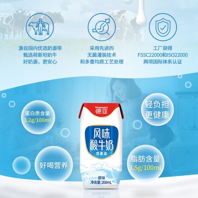 德亚/Weidendorf 锦绣凝华风味酸牛奶原味200ml*10礼盒 营养早餐奶 蛋白质含量3.2g,营养轻负担,大人小孩皆宜 兑换价格 2400 里程 会员卡别 终身白金卡 白金卡 金卡 银卡 普通卡 儿童卡 服务 由 壮乡优品生活馆 发货并提供售后 规格: 盒装 购买数量: 件 库存件 配送地址: 立即购买 加入购物车 成功添加到购物车 关闭 购物车共有 种商品 总金额为: 组合销售 产品介绍 产品规格 售后服务 产品咨询 发现好货 蒙牛 特仑苏纯牛奶苗条装250ml×12盒 2900 里程 三元 经典小方白全脂纯牛奶250ml*24盒牛奶 整箱 3400 里程 伊利金典纯牛奶250ml*12盒整箱 2200 里程 三元 极致 全脂纯牛奶250ml*12盒 优质乳蛋白 恪守天然亲和 2900 里程 蒙牛 特仑苏纯牛奶250ml*12盒3.6g乳蛋白礼盒整箱装 2300 里程