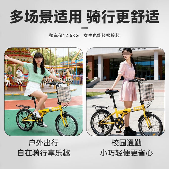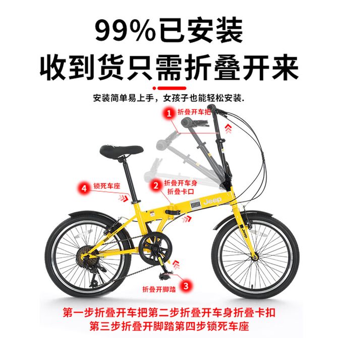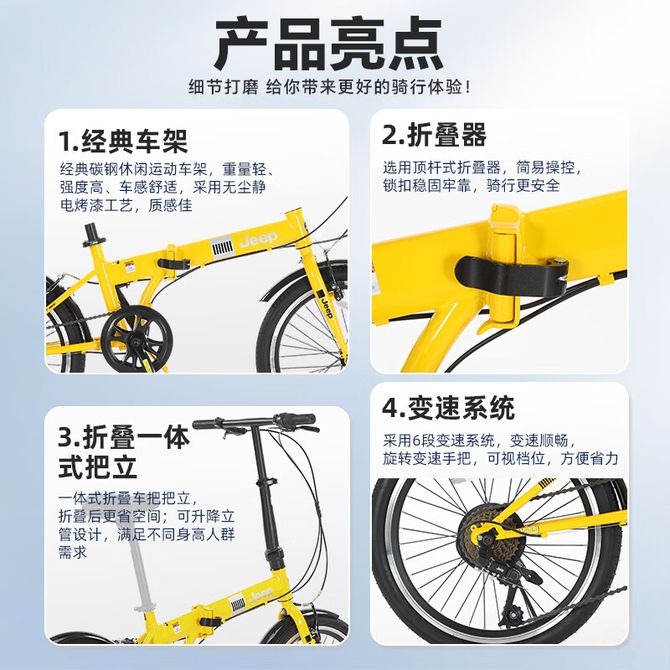 Jeep 吉普可折叠自行车20寸6速折叠变速超轻便携通勤代步男女-HL200 炫丽黄 20寸【身高推荐155-175CM】 6速 吉普折叠自行车20寸6速HL200 兑换价格 41300 里程 会员卡别 终身白金卡 白金卡 金卡 银卡 普通卡 儿童卡 服务 由 赛丹孚运动户外专营店 发货并提供售后 颜色: 黄色 购买数量: 件 库存件 配送地址: 立即购买 加入购物车 成功添加到购物车 关闭 购物车共有 种商品 总金额为:
