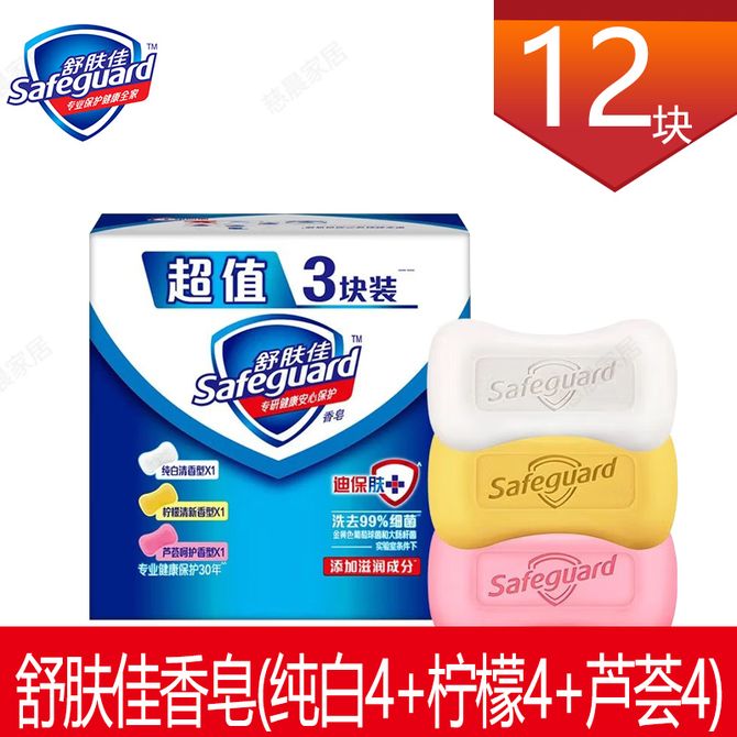 舒肤佳 香皂12块皂(纯白4+柠檬4+芦荟4)肥皂 新旧包装随机 一般48小时内发出,节假日发货可能会有延迟,部分商品可能进行包装变更,还请多多谅解! 兑换价格 3100 里程 会员卡别 终身白金卡 白金卡 金卡 银卡 普通卡 儿童卡 服务 由 慈晨家居日用专营店 发货并提供售后 化妆品容量: 组合 购买数量: 件 库存件 配送地址: 立即购买 加入购物车 成功添加到购物车 关闭 购物车共有 种商品 总金额为: 组合销售 产品介绍 产品规格 售后服务 产品咨询 发现好货 舒肤佳洗手液纯白清香420ml+芦荟420ml (抑菌99.9% 温和洁净)(新老包装随机发货) 2200 里程 舒肤佳香皂超值六块装(纯白4块+薰衣草2块) 1400 里程 舒肤佳 焕肤红石榴108gX3 香皂(新老包装随机发货) 1800 里程 舒肤佳香皂100g*4块纯白清香 1100 里程 舒肤佳/Safeguard 香皂超值四块装(2纯白+2柠檬) 1100 里程