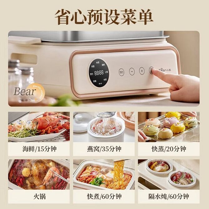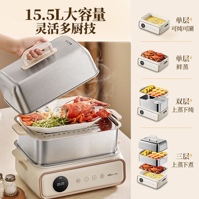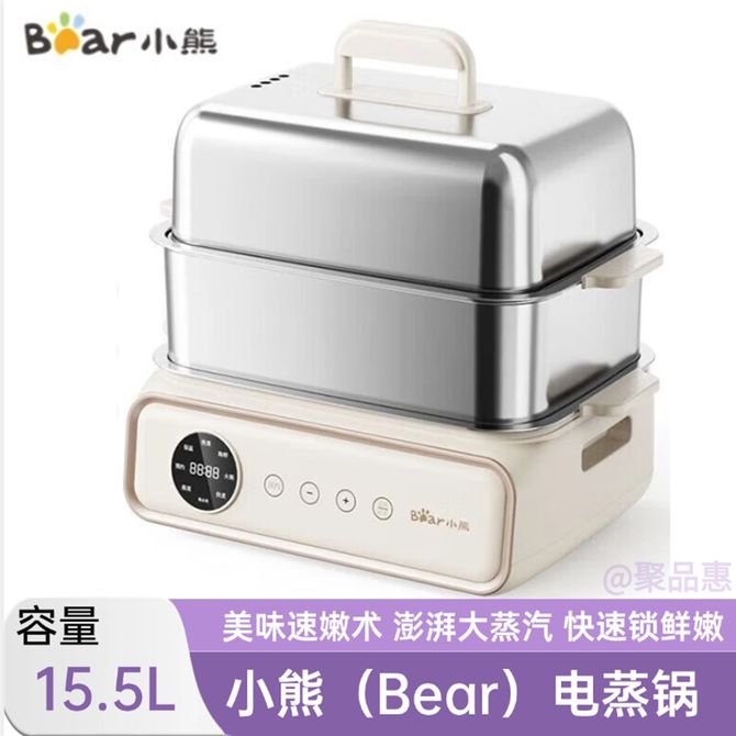 小熊/Bear 电蒸锅 家用多功能蒸炖煮一体三层灵活组合15.5L大容量不锈钢双保温模式蒸炖锅 一锅多能 6大菜单 15.5升大容量 微电脑触控 兑换价格 19100 里程 会员卡别 终身白金卡 白金卡 金卡 银卡 普通卡 儿童卡 服务 由 聚品惠家电生活馆 发货并提供售后 颜色: 其他 购买数量: 件 库存件 配送地址: 立即购买 加入购物车 成功添加到购物车 关闭 购物车共有 种商品 总金额为: 组合销售 产品介绍 产品规格 售后服务 产品咨询 发现好货 苏泊尔(SUPOR)空气炸锅 家用多功能4.2L大容量 烤箱薯条机 无油烟电炸锅 大功率 无油低脂煎炸锅KJ42D811 6500 里程 苏泊尔(SUPOR)空气炸锅家用3L大容量电炸锅 蒸汽嫩炸多功能无油烟煎炸薯条机烤箱KD30DQ815 21700 里程 美的/Midea 空气炸锅 可视 不用翻面 金属内腔 蒸汽嫩炸 三档烘烤风力 5L KZC5089 10700 里程 小熊/Bear 空气炸锅 4D漩烤不用翻面 全自动 5L实用大容量 可视 蒸汽嫩炸 控油脱脂 炸烤箱一体机 9100 里程 小熊/Bear 家用多功能锅电炒锅电火锅电煮锅电锅分体式C60J5 6500 里程