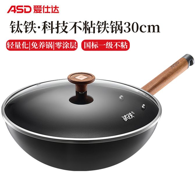 爱仕达/ASD 钛铁不粘炒锅 30cm厨房家用无涂层炒菜锅导热均匀防滑螺纹锅底 燃气灶电磁炉通用 有钛不粘铁锅 CF34T8Q