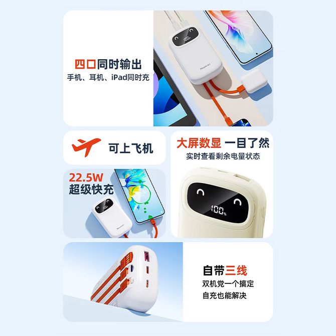 组合销售 产品介绍 产品规格 售后服务 产品咨询 发现好货 ZNNCO 充电宝20000毫安时超薄小巧迷你自带线大容量快充移动电源便携苹果华为小米2万mAh手机 4200 里程 睿量/Remax 磁吸无线充电宝 Magsafe快充 5000mAh超薄小巧便携移动电源 手机背夹迷你移动电源 适用于苹果华为小米手机 RPP-107 4600 里程 雷摄 T68S【3C认证可上飞机】充电宝10000毫安 移动电源 22.5W快充丨1万毫安丨多口输出 1700 里程 纽曼(Newmine) 自带四线充电宝 3C认证 LED智能数显10000毫安移动电源 AL03 经典黑 3000 里程 雷摄 【3C认证】LS-YDZJ01 10000毫安 四线多功能移动电源 黑色 2000 里程