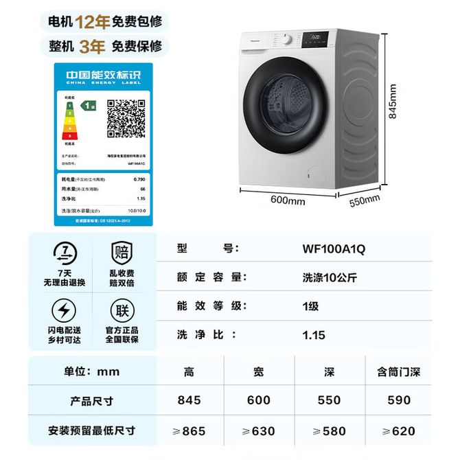 海信/Hisense 筒洗衣机全自动 10公斤大容量 健康高洗净比智能洗一级能效 WF100A1Q