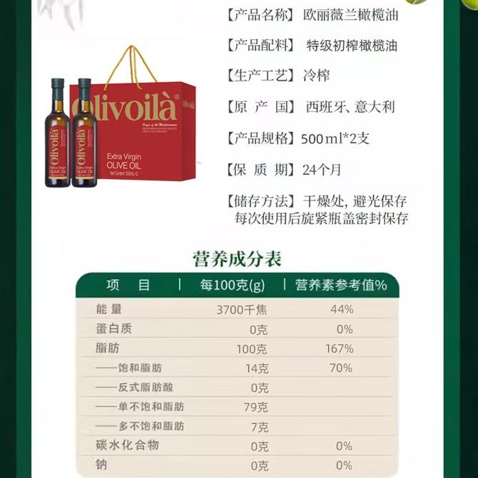 欧丽薇兰 特级初榨橄榄油 500ml*2瓶 红标礼盒装 特级初榨纯正橄榄油 兑换价格 6400 里程 会员卡别 终身白金卡 白金卡 金卡 银卡 普通卡 儿童卡 服务 由 润润食品专营店 发货并提供售后 油品规格: 500ml 购买数量: 件 库存件 配送地址: 立即购买 加入购物车 成功添加到购物车 关闭 购物车共有 种商品 总金额为: 组合销售 产品介绍 产品规格 售后服务 产品咨询 发现好货 长寿花 金胚玉米油食用油非转基因压榨一级 1.8L 2200 里程 珍佰粮菜籽油5L 5500 里程 福临门 一级大豆油900ML/瓶 优质家用食用油 1100 里程 福临门 家香味食用油 沂蒙土榨 花生仁油900ml 1600 里程 金龙鱼 浓香花生油5L 大桶装物理压榨一级厨房烹饪炒菜植物油粮油家庭食用油 浓香花生油食用油 5000 里程