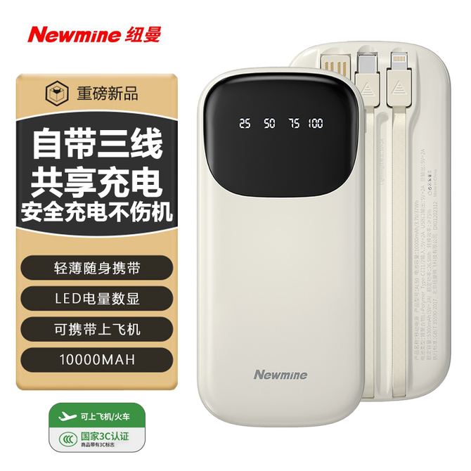 纽曼(Newmine) 【国家3C认证】10000mAh移动电源自带三线轻薄迷你高清数显充电宝 奶茶色 3C认证 可上飞机 机身有3C标识 兑换价格 2600 里程 会员卡别 终身白金卡 白金卡 金卡 银卡 普通卡 儿童卡 服务 由 贝洛美智能科技精品馆 发货并提供售后 电池容量: 8001mAh-10000mAh 颜色: 其他 购买数量: 件 库存件 配送地址: 立即购买 加入购物车 成功添加到购物车 关闭 购物车共有 种商品 总金额为: 组合销售 产品介绍 产品规格 售后服务 产品咨询 发现好货 ZNNCO 充电宝20000毫安时超薄小巧迷你自带线大容量快充移动电源便携苹果华为小米2万mAh手机 4200 里程 睿量/Remax 磁吸无线充电宝 Magsafe快充 5000mAh超薄小巧便携移动电源 手机背夹迷你移动电源 适用于苹果华为小米手机 RPP-107 4600 里程 雷摄 T68S【3C认证可上飞机】充电宝10000毫安 移动电源 22.5W快充丨1万毫安丨多口输出 1700 里程 纽曼(Newmine) 自带四线充电宝 3C认证 LED智能数显10000毫安移动电源 AL03 经典黑 3000 里程 雷摄 【3C认证】LS-YDZJ01 10000毫安 四线多功能移动电源 黑色 2000 里程
