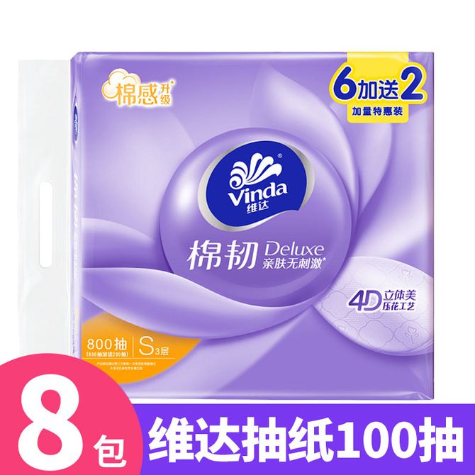 维达 三层抽取式卫生纸巾100抽8包/提 抽纸 V2833 1提=8包 2提=16包 3提=24包 如有购买售后咨询可电话联系客服17600816768 兑换价格 1100-2400 里程 会员卡别 终身白金卡 白金卡 金卡 银卡 普通卡 儿童卡 服务 由 天恒清洁纸品专营店 发货并提供售后 包装数量: 1提 2提 3提 购买数量: 件 库存件 配送地址: 立即购买 加入购物车 成功添加到购物车 关闭 购物车共有 种商品 总金额为: 组合销售 产品介绍 产品规格 售后服务 产品咨询 发现好货 维达卷纸 卫生纸实惠装厕纸家用厕所纸巾手纸整箱批有芯大卷家庭装 1200-2300 里程 维达 Vinda 卷纸 140g/卷*10卷 蓝色经典3层卫生纸 1300 里程 心相印抽纸 茶语丝享系列 量贩家庭装 3层*100抽*4包(茶香 压花) 1100 里程 心相印 经典系列 二层面巾纸 180抽*6包*1提 1100 里程 维达Vinda 超韧系列抽纸(3层*130抽*6包) 原生木浆卫生餐巾纸婴儿面巾纸 6包优惠装 1100 里程
