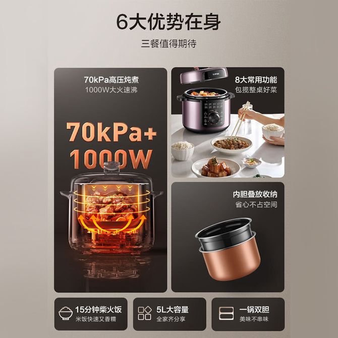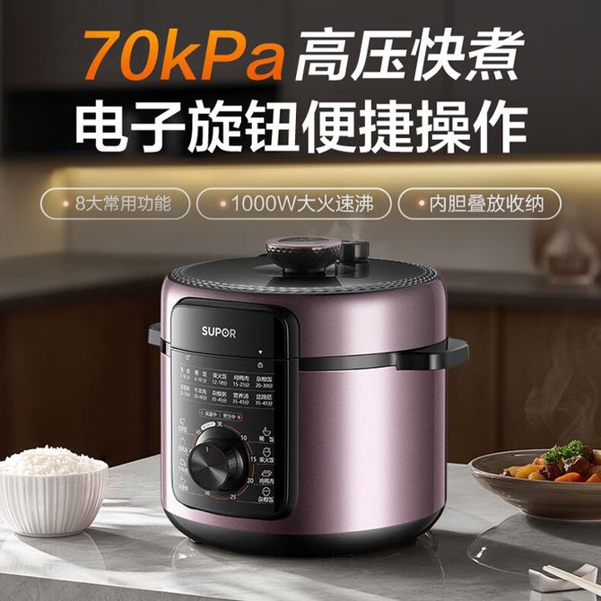 组合销售 产品介绍 产品规格 售后服务 产品咨询 发现好货 苏泊尔(SUPOR)电压力锅 6升大容量 智能触控 球釜双胆 开盖收汁 一键排压 SY-60YC8001Q 高压锅 16900 里程 美的/Midea 电压力锅家用5L大容量多功能高压锅双胆一键收汁智能预约不粘电高压锅电饭锅煮粥煲汤锅 一锅双胆【一键收汁入味】 YL50M1-702 10600 里程 苏泊尔(SUPOR) 5L电压力锅家用电高压锅双胆高压电饭锅煮饭智能预约 SY-50YC8186 11300 里程 美的/Midea 电压力锅 【一锅双胆】5L全自动家用智能预约 上蒸下煮 不粘双胆煲汤炖肉 YL50Q3-451 10900 里程 美的/Midea 电压力锅 高压锅家用电压力煲智能预约电饭煲大容量多功能定时预约电饭煲3-8人单胆旋钮款4L MY-E4809 8700 里程