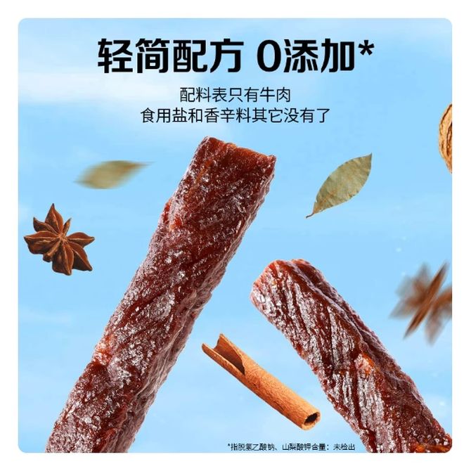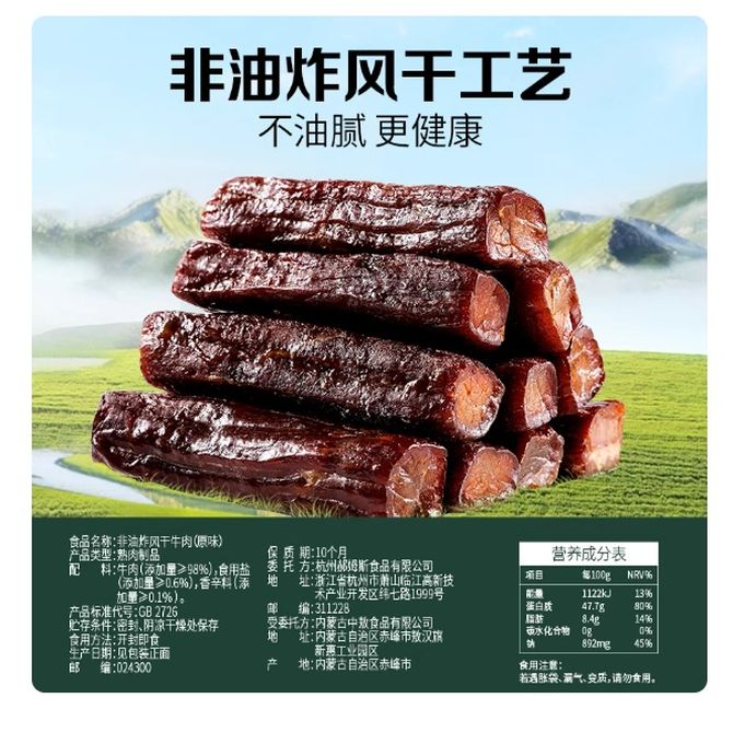 组合销售 产品介绍 产品规格 售后服务 产品咨询 发现好货 蒙都 风干牛肉干 500g (原味/五香/孜然/香辣)下单备注口味 新老包装随机 7000 里程 蒙都 酱牛肉200g*2袋 卤牛肉 熟食 内蒙古特产 五香真空包装熟牛肉 4100 里程 百草味 白芝麻猪肉脯100g 休闲零食肉干肉脯 1100 里程 百草味 原切牛肉片50g*1袋 牛肉干休闲零食 特产小吃肉干 1500 里程 三只松鼠(Three Squirrels) 猪肉脯自然片 肉干肉脯休闲零食特产小吃150g/袋*2袋 1700 里程