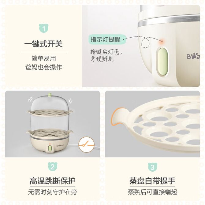 组合销售 产品介绍 产品规格 售后服务 产品咨询 发现好货 小熊/Bear 煮蛋器 蒸蛋器 单双层家用多功能高温保护早餐鸡蛋羹迷你电蒸锅 ZDQ-D12R3 2000 里程 小熊/Bear 蒸蛋器 ZDQ-D12R3 暖灰色 煮蛋器多功能家用小型双层非自动断电煮蛋神器 2900 里程 小熊/Bear 煮蛋器蒸蛋器单双层家用高温断电迷你早餐鸡蛋羹蒸鸡蛋器蒸蛋机炖蛋器便携式电蒸锅ZDQ-B14Q1 2200 里程 小熊/Bear 煮蛋器蒸蛋器单双层家用高温断电迷你早餐器蒸蛋机炖蛋器蒸蛋锅便携式电蒸锅ZDQ-B14Q1带不锈钢蒸碗 2600 里程 小熊/Bear 煮蛋器 小型家用可定时不锈钢蒸蛋器自动断鸡蛋羹迷你电蒸锅ZDQB07C3 3500 里程
