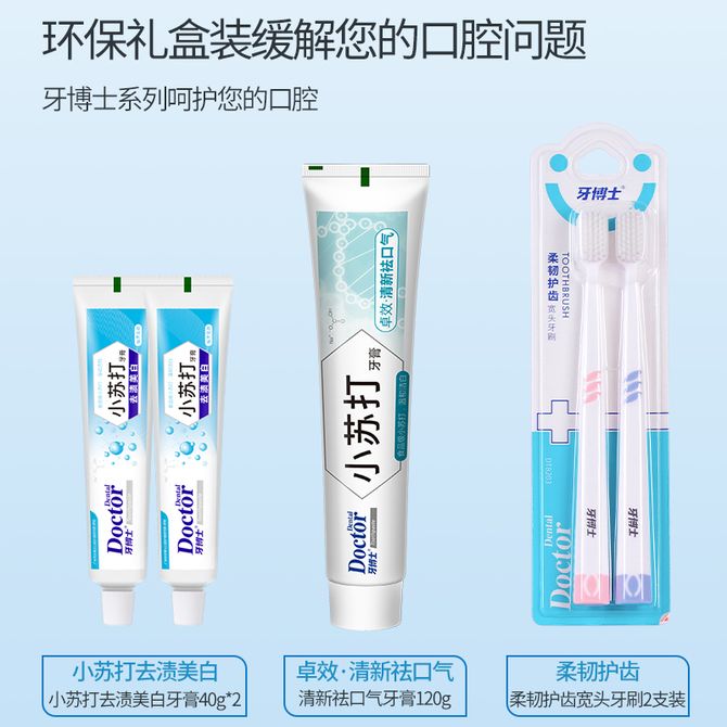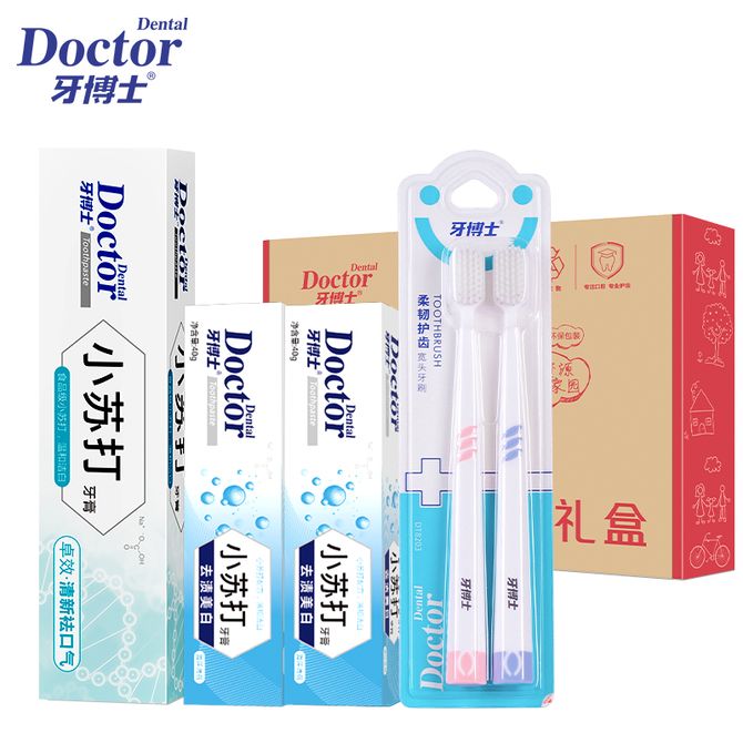 牙博士 小苏打牙膏【家庭套装】洁白牙齿减轻牙渍牙垢减少牙菌斑护牙龈牙周清新口气 牙博士环保礼盒装:清新祛口气120g*1 支 小苏打去渍美白牙膏40g*2支 柔韧护齿宽头牙刷2支装*1 兑换价格 1700 里程 会员卡别 终身白金卡 白金卡 金卡 银卡 普通卡 儿童卡 服务 由 京狮文化生活馆 发货并提供售后 套装分类: 礼品套装 颜色: 其他 化妆品容量: 组合 购买数量: 件 库存件 配送地址: 立即购买 加入购物车 成功添加到购物车 关闭 购物车共有 种商品 总金额为: 组合销售 产品介绍 产品规格 售后服务 产品咨询 发现好货 舒客宝贝三丽鸥儿童牙膏牙刷套装 2-12岁(鲜橙味60g*2+草莓味60g*2+成长儿童牙刷2支)(新老款随机发货) 1700 里程 舒客儿童成长牙膏牙刷套装纤细软毛宝宝牙刷1支+牙膏40g*2(2-12岁通用)儿童护齿1+2套装(新老包装随机发) 1700 里程 舒客 专效特护 清洁口腔柔软护龈成人软毛牙刷 6支家庭装(新老包装随机发货) 1200 里程 舒客炭丝能量牙刷 细软毛护龈竹炭刷丝清新口气去口气【全新升级】 炭丝牙刷6支 1300 里程 舒客成人超软毛宽刷头牙刷2支情侣装(颜色随机发货) 1200 里程