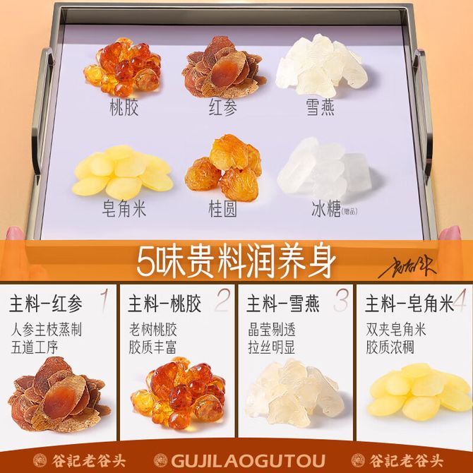 谷记老谷头/GUJILAOGUTOU 红参桃胶雪燕皂角米675g(30罐) 养颜羹 老谷头红参桃胶雪燕皂角米胶养组合鲜炖品桃胶羹 桃胶雪燕皂角米 兑换价格 7400 里程 会员卡别 终身白金卡 白金卡 金卡 银卡 普通卡 儿童卡 服务 由 啊兔食品专营店 发货并提供售后 规格: 盒装 购买数量: 件 库存件 配送地址: 立即购买 加入购物车 成功添加到购物车 关闭 购物车共有 种商品 总金额为: