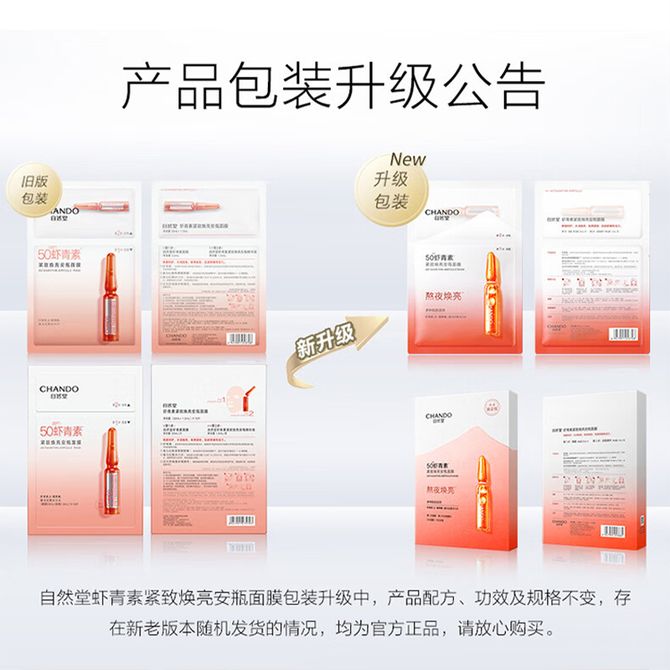 自然堂/Chando 虾青素紧致焕亮安瓶面膜 安瓶1.5mL+面膜33mL 5片装 深层保湿 焕亮升级 兑换价格 1700 里程 会员卡别 终身白金卡 白金卡 金卡 银卡 普通卡 儿童卡 服务 由 辽尊个护美妆店 发货并提供售后 面膜规格: 盒 购买数量: 件 库存件 配送地址: 立即购买 加入购物车 成功添加到购物车 关闭 购物车共有 种商品 总金额为: 组合销售 产品介绍 产品规格 售后服务 产品咨询 发现好货 御泥坊面膜 虾青素时光焕颜黑面膜保湿补水黑面膜 5片/盒 1200 里程 御泥坊 虾青素保湿补水黑面膜5片/盒*2盒(共10片) 2200 里程 韩后 红石榴红茶紧致补水面膜 保湿锁水男女士可用护肤品 【补水紧致】红石榴面膜20片 2600 里程 自然堂/Chando 极地等渗补水修护面膜 28ml×5片 舒缓温和水润强韧 1100 里程 欧莱雅(LOREAL)复颜玻尿酸水光充盈导入淡纹膨润面膜35g*15片 8900 里程