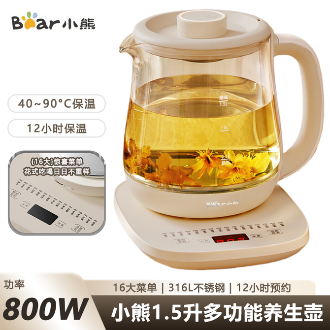 小熊/Bear 1.5L养生壶 煮茶器 烧水壶 煮茶壶 316L不锈钢多段保温迷你玻璃花茶壶 16大菜单1.5升容量 预约保温 兑换价格 4800 里程 会员卡别 终身白金卡 白金卡 金卡 银卡 普通卡 儿童卡 服务 由 中农创家电生活馆 发货并提供售后 颜色: 其他 购买数量: 件 库存件 配送地址: 立即购买 加入购物车 成功添加到购物车 关闭 购物车共有 种商品 总金额为: