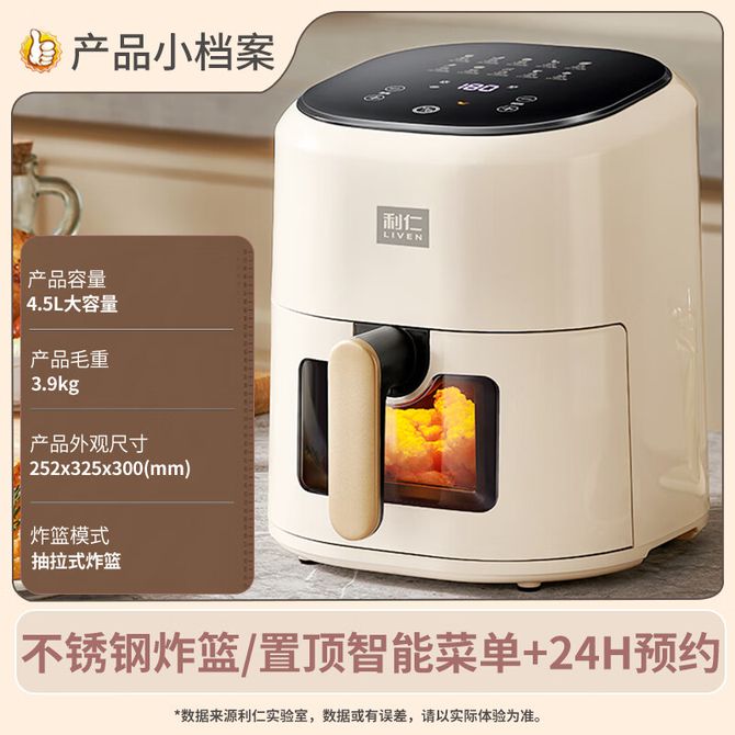 利仁/LIVEN 空气炸锅家用304不锈钢炸篮智能可视化免翻面全自动电炸锅蒸汽嫩炸多功能空气炸烤箱一体机薯条机 【0涂层不锈钢炸篮】 4.5L 智能可视 利仁空气炸锅KZ-D4511(升级款) 兑换价格 11300 里程 会员卡别 终身白金卡 白金卡 金卡 银卡 普通卡 儿童卡 服务 由 赛丹孚小家电专营店 发货并提供售后 颜色: 其他 购买数量: 件 库存件 配送地址: 立即购买 加入购物车 成功添加到购物车 关闭 购物车共有 种商品 总金额为: