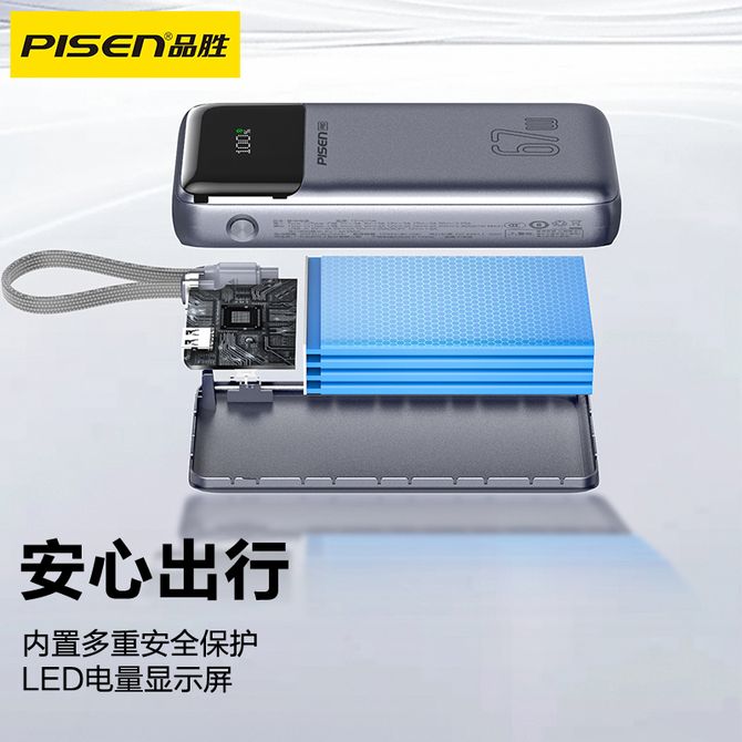 品胜/Pisen 3C认证充电宝可上飞机自带Type-C线67W快充20000毫安兼容65W/22.5W/20W大容量大功率移动电源苹果华为小米手机笔记本电脑
