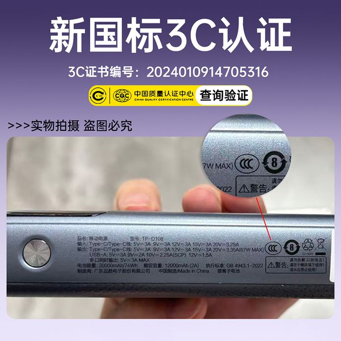 3C认证 可上飞机 20000毫安 67W 可充笔记本 自带C口线 适用苹果17/16华为小米手机平板电脑