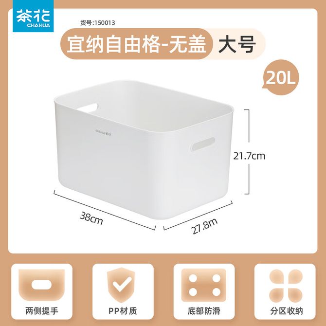 茶花 家用桌面收纳盒子化妆品置物盒 大号#无盖38*27.8*21.7【20L】【1个装】 两侧提手 PP材质 底部防滑 分区收纳 兑换价格 1700 里程 会员卡别 终身白金卡 白金卡 金卡 银卡 普通卡 儿童卡 服务 由 陈记严选 发货并提供售后 颜色: 白色 购买数量: 件 库存件 配送地址: 立即购买 加入购物车 成功添加到购物车 关闭 购物车共有 种商品 总金额为: