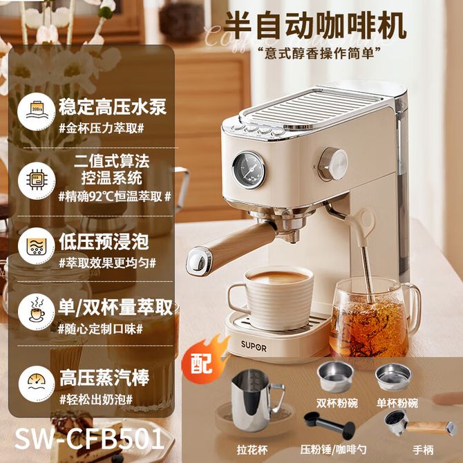 苏泊尔(SUPOR) 咖啡机SW-CFB501 意式家用浓缩半自动 礼物送长辈 办公室小型便携摩卡手冲壶 意式家用浓缩半自动 礼物送长辈 办公室小型便携摩卡手冲壶 兑换价格 26100 里程 会员卡别 终身白金卡 白金卡 金卡 银卡 普通卡 儿童卡 服务 由 纳华优选 发货并提供售后 颜色: 米白色 购买数量: 件 库存件 配送地址: 立即购买 加入购物车 成功添加到购物车 关闭 购物车共有 种商品 总金额为: