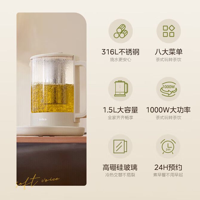 组合销售 产品介绍 产品规格 售后服务 产品咨询 发现好货 九阳/Joyoung 养生壶1.5L茶具电茶壶煮茶壶花茶壶玻璃煮茶器煎药壶中药锅药膳电水壶烧水壶 3900 里程 九阳/Joyoung 养生壶迷你玻璃花茶壶煮茶器 12大功能11档温度 电水壶热水壶烧水壶 1.5L DGD1506BQ 3900 里程 美的/Midea 养生壶 1.5L家用多功能小型全自动办公室烧水壶加厚玻璃煮茶热水壶 MK-YS15P201 4200 里程 美的/Midea 养生壶 1.5L家用养生壶全自动玻璃烧水壶24h预约烧水壶12小时防干烧保护智能恒温 MK-YS15P202 3700 里程 美的/Midea 养生壶 1.5L全自动电热水壶 24h预约12小时智能恒温 14大功能11档控温 花茶壶煮茶器MK-Y12Q 3500 里程
