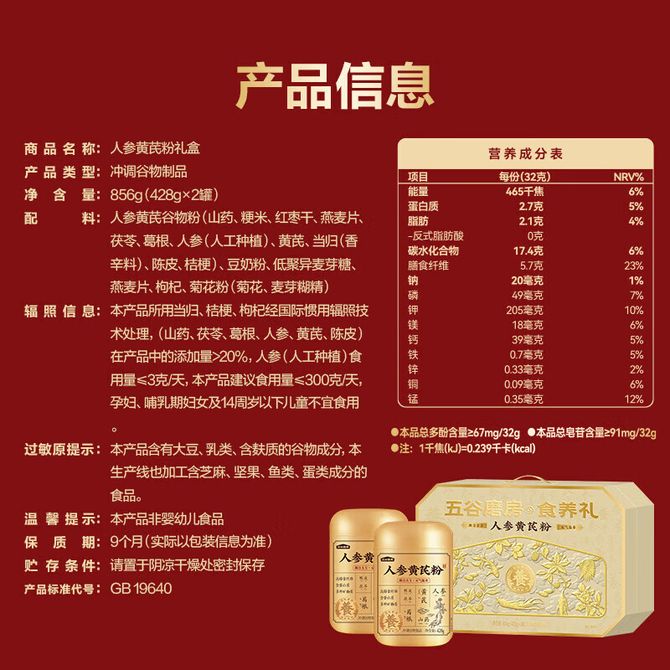 五谷磨房 葛根陈皮茯苓营养冲调代餐 高端送礼 人参黄芪礼盒856g 葛根陈皮茯苓营养冲调代餐 高端送礼 人参黄芪礼盒856g 兑换价格 8200 里程 会员卡别 终身白金卡 白金卡 金卡 银卡 普通卡 儿童卡 服务 由 中优盈信品质生活馆 发货并提供售后 规格: 盒装 购买数量: 件 库存件 配送地址: 立即购买 加入购物车 成功添加到购物车 关闭 购物车共有 种商品 总金额为: 组合销售 产品介绍 产品规格 售后服务 产品咨询 发现好货 阴山优麦即食纯燕麦片 全胚芽裸燕麦 营养早餐谷物 膳食纤维 1000g 罐装 2400 里程 燕之坊 红豆薏米枸杞粉 红小豆赤小豆薏米薏仁代餐粉 500g 低卡饱腹 3500 里程 穗格氏SHEGURZ 纯燕麦片无添糖澳洲燕麦片1.52kg营养早餐懒人即食谷物冲饮 1200 里程 西麦 即食燕麦片1000g桶装营养早餐谷物代餐无额外添加蔗糖 1400 里程 燕之坊 黑八宝450g 1300 里程