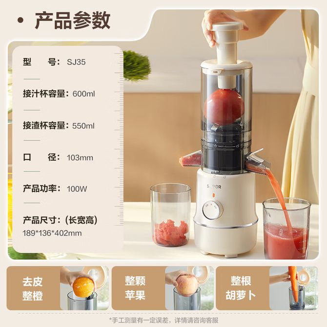 苏泊尔(SUPOR) 榨汁机SJ35 渣汁分离原汁机多功能家用鲜榨果蔬机大口径免切水果搅拌机电动果汁机 渣汁分离原汁机多功能家用鲜榨果蔬机大口径免切水果搅拌机电动果汁机 兑换价格 17400 里程 会员卡别 终身白金卡 白金卡 金卡 银卡 普通卡 儿童卡 服务 由 纳华优选 发货并提供售后 颜色: 白色 购买数量: 件 库存件 配送地址: 立即购买 加入购物车 成功添加到购物车 关闭 购物车共有 种商品 总金额为: