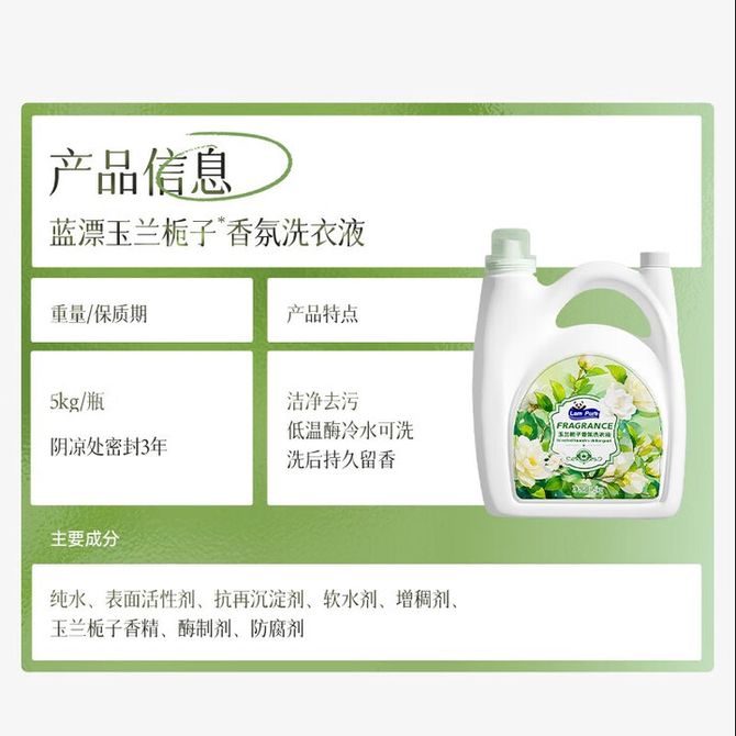 蓝漂 玉兰栀子香洗衣液5kg*1桶 低温酶高效洁净去渍柔顺护衣留香 【新调香-玉兰栀子10斤】 表活+低温酶去污力 洁净效果可见 兑换价格 2700 里程 会员卡别 终身白金卡 白金卡 金卡 银卡 普通卡 儿童卡 服务 由 锦宁商贸 发货并提供售后 净含量: 其他容量 清洁剂容量: 其他容量 购买数量: 件 库存件 配送地址: 立即购买 加入购物车 成功添加到购物车 关闭 购物车共有 种商品 总金额为: 组合销售 产品介绍 产品规格 售后服务 产品咨询 发现好货 蓝月亮 深层洁净洗衣液4斤 1kgx1瓶+500gx2补充装 薰衣草香 强效去渍 1500 里程 威露士/Walch La有氧洗洗衣液套装 4斤松木清香(瓶1L+袋500ml*2) 除菌除螨 1900 里程 威露士 洗衣液除菌机洗手洗家用除螨去污1L*1瓶 1500 里程 蓝月亮 亮白增艳洗衣液2斤 1kg*1瓶 1100 里程 蓝月亮 护理洗衣液去污去渍 保护衣物纤维和原色 薰衣草香 1kg*2瓶 持久留香 速溶易漂 温和配方 1500 里程