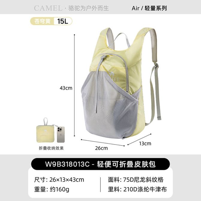 骆驼/Camel 户外运动双肩包徒步旅游轻便登山包爬山装备背包轻量化书包可折叠双肩包 骆驼/Camel 双肩包(折叠包)W9B318013C 兑换价格 3000 里程 会员卡别 终身白金卡 白金卡 金卡 银卡 普通卡 儿童卡 服务 由 亿宇安百户外专营店 发货并提供售后 颜色: 黑色 黄色 灰色 蓝色 绿色 紫色 购买数量: 件 库存件 配送地址: 立即购买 加入购物车 成功添加到购物车 关闭 购物车共有 种商品 总金额为: 组合销售 产品介绍 产品规格 售后服务 产品咨询 发现好货 匹克/PEAK 防泼水男女户外轻便旅行双肩运动登山背包10L YW41102 5400 里程 骆驼/Camel 户外双肩包男女徒步旅行运动登山包大容量轻便背包 3FI101C 【赠送登山杖1根】 13000 里程 TFO 北美系列户外登山包30L9202403F00 黑色 35L 17400 里程 TFO 登山户外背包 男女大容量轻便耐磨电脑仓 旅行骑行野营双肩包 蓝色 40L 9600 里程 驿客/EASTSKY 时尚户外通勤背包(黑色/灰色两色可选)EKB-8007 2200 里程