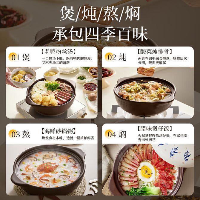 组合销售 产品介绍 产品规格 售后服务 产品咨询 发现好货 荣事达/Royalstar 煲锅 砂锅煲汤熬药煮粥焖饭砂锅陶瓷炖汤沙锅家用养生汤锅瓦煲瓦罐4.6L 3900 里程 爱仕达(ASD) 煲锅 砂锅煲汤炖锅2.5L陶瓷煲仔饭砂锅燃气灶明火专用 4800 里程 炊大皇/Cookerking 砂锅5L耐高温陶瓷煲多用炖锅汤锅家用养生煲陶瓷锅明火煤燃气灶专用TCXW5002 4400 里程 炊大皇/Cookerking 砂锅 6L耐高温陶瓷煲多用炖锅汤锅 家用养生煲陶瓷锅 明火煤燃气灶专用TCXW6003 5300 里程 苏泊尔(SUPOR) 砂锅煲汤锅炖锅4.5L养生煲耐高温不开裂陶瓷煲EB45MAT01 6000 里程