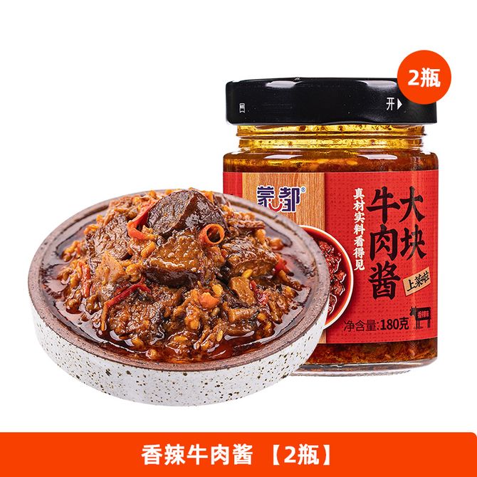 蒙都 香辣牛肉酱 拌饭酱香辣大块牛肉酱 拌面辣椒酱180g*2瓶 香辣牛肉酱 拌面辣椒酱180g*2瓶 兑换价格 1600 里程 会员卡别 终身白金卡 白金卡 金卡 银卡 普通卡 儿童卡 服务 由 中优盈信品质生活馆 发货并提供售后 规格: 罐装 购买数量: 件 库存件 配送地址: 立即购买 加入购物车 成功添加到购物车 关闭 购物车共有 种商品 总金额为: