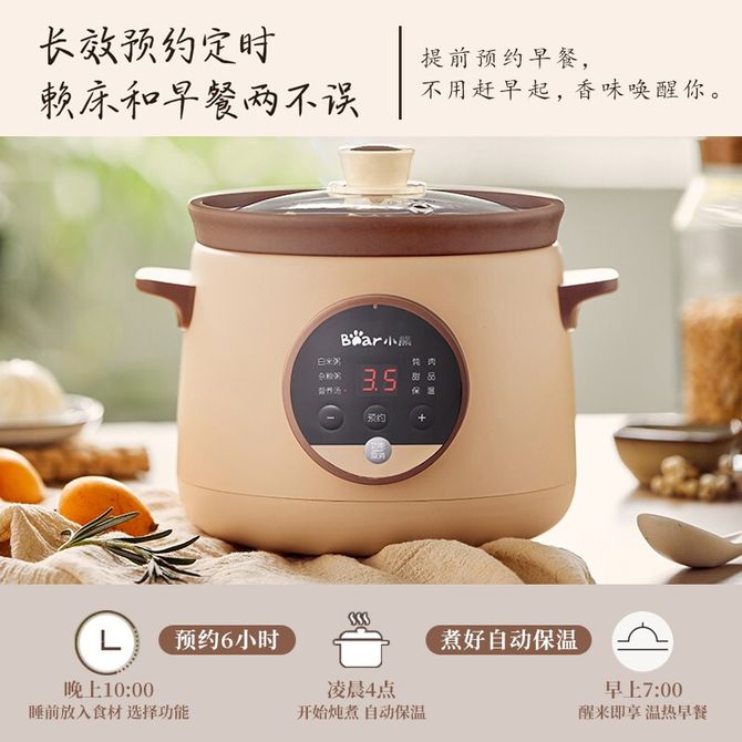 小熊/Bear 电炖锅电炖盅婴儿辅食锅紫砂锅燕窝炖盅电砂锅煲汤锅炖汤锅 文火细熬 汤香浓肉酥软 新式热水快炖速炖汤类更省时 兑换价格 5200 里程 会员卡别 终身白金卡 白金卡 金卡 银卡 普通卡 儿童卡 服务 由 聚品惠家电生活馆 发货并提供售后 颜色: 其他 购买数量: 件 库存件 配送地址: 立即购买 加入购物车 成功添加到购物车 关闭 购物车共有 种商品 总金额为: 组合销售 产品介绍 产品规格 售后服务 产品咨询 发现好货 小熊/Bear 电炖锅1-2人小炖锅煮粥锅智能预约定时煲汤锅炖汤锅燕窝炖盅 4400 里程 苏泊尔(SUPOR) 电火锅家用不粘煎涮炖煮多功能4L大容量一体式大火力电煮锅不粘煎涮炖煮多功能料理锅 H40YK757 5700 里程 西屋/Westinghouse 多功能电煮锅电炖锅1.6L一锅多能WFB16A 11600 里程 苏泊尔(SUPOR) 电火锅 宿舍小电锅学生寝室一体泡面小火锅 多功能锅涮肉涮菜 1.7L 【 单锅】H17YK489 3000 里程 小熊(Bear)电炖锅电炖盅煮粥神器煲汤锅炖汤锅婴儿煮粥锅熬粥燕窝炖盅DDG-E15K2 4800 里程