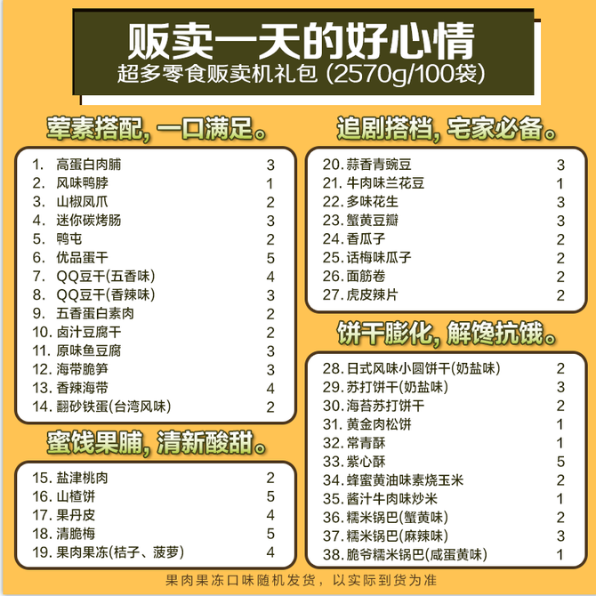 来伊份LYFEN 贩卖机零食大礼包100袋超5斤 卤味蜜饯 宅家必备囤货王 解馋无负担 来伊份LYFEN 贩卖机零食大礼包100袋超5斤 卤味蜜饯 宅家必备囤货王 解馋无负担 兑换价格 4300 里程 会员卡别 终身白金卡 白金卡 金卡 银卡 普通卡 儿童卡 服务 由 繁星尚品 发货并提供售后 规格: 组合 购买数量: 件 库存件 配送地址: 立即购买 加入购物车 成功添加到购物车 关闭 购物车共有 种商品 总金额为: