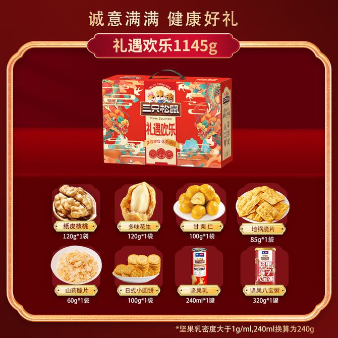 三只松鼠(Three Squireels) 坚果礼盒休闲零食大礼包节日礼品礼盒春节年货送礼干果 礼遇欢乐1145g 礼遇欢乐1145g(含3种坚果+5款零食) 兑换价格 3500 里程 会员卡别 终身白金卡 白金卡 金卡 银卡 普通卡 儿童卡 服务 由 优米酷食品专营店 发货并提供售后 规格: 礼盒 购买数量: 件 库存件 配送地址: 立即购买 加入购物车 成功添加到购物车 关闭 购物车共有 种商品 总金额为: 组合销售 产品介绍 产品规格 售后服务 产品咨询 发现好货 晋龙鲜鸡蛋40枚新鲜鸡蛋早餐营养食材1800g左右 2000 里程 黄天鹅 黄天鹅 可生食鸡蛋标准 3.18斤/盒30枚 3300 里程 沃隆每日坚果A款750g礼盒(25克*30) 6100 里程 晋龙鲜鸡蛋六无蛋30枚鸡蛋1.4kg礼盒装健康轻食早餐 1700 里程 稻香村 糕点礼盒1500g/盒 小吃点心礼盒 糕点点心礼盒 传统特产 3900 里程