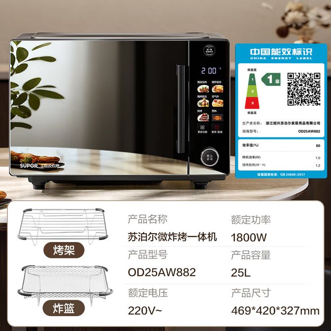 苏泊尔(SUPOR) 变频微波炉OD25AW882 烤箱 微炸烤一体机家用空气炸锅三合一 25L大容量一级能效小型光波炉 25L 0涂层不锈钢腔体 烤箱 微炸烤一体机家用空气炸锅三合一 25L大容量一级能效小型光波炉 兑换价格 71700 里程 会员卡别 终身白金卡 白金卡 金卡 银卡 普通卡 儿童卡 服务 由 纳华优选 发货并提供售后 颜色: 灰色 购买数量: 件 库存件 配送地址: 立即购买 加入购物车 成功添加到购物车 关闭 购物车共有 种商品 总金额为: 组合销售 产品介绍 产品规格 售后服务 产品咨询 发现好货 美的/Midea 空气炸锅 5L可视窗口免翻面电炸锅 双旋钮控时控温 食品接触不粘涂层 MF-KZE5089 8700 里程 荣事达5.5L大容量 家用智能触控多功能空气炸锅 RS-AF181L 10900 里程 美的/Midea 空气炸锅家用新款一体多功能免翻面电炸锅电烤箱华凌烹饪机KZE4501TQ 6500 里程 美的/Midea 空气炸锅 5L家用大容量 可视窗口 免翻面 蒸汽嫩炸 金属内腔 多功能智能精准控温 电炸锅KZC5089 5L 10700 里程 美的/Midea 空气炸锅 免翻面可视家用大容量 5L 多功能 不沾易洗 蒸汽嫩炸 9600 里程
