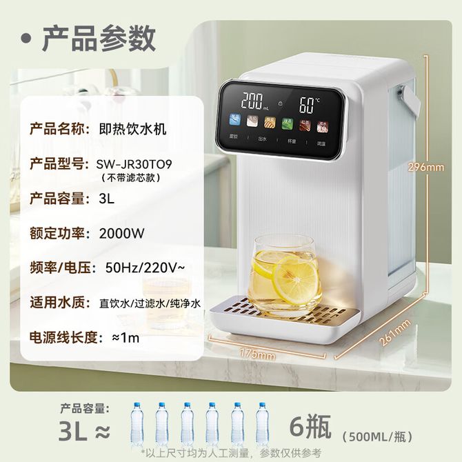 苏泊尔(SUPOR) 即热式饮水机SW-JR30T09 便携泡奶烧水壶1S速热3秒出水家用台式一体免安装电水壶冲茶泡奶 便携泡奶烧水壶1S速热3秒出水家用台式一体免安装电水壶冲茶泡奶 兑换价格 26100 里程 会员卡别 终身白金卡 白金卡 金卡 银卡 普通卡 儿童卡 服务 由 纳华优选 发货并提供售后 颜色: 白色 购买数量: 件 库存件 配送地址: 立即购买 加入购物车 成功添加到购物车 关闭 购物车共有 种商品 总金额为: 组合销售 产品介绍 产品规格 售后服务 产品咨询 发现好货 小熊/Bear 桶装水抽水器 电动抽水泵自动饮用水桶上水器 饮水机抽水器 折叠防尘 YSJD-06H5 2600 里程 小熊/Bear 抽水器桶装水 电动压水器自动吸水器矿泉水上水器饮水机大桶水取水器抽水泵316不锈钢 2200 里程 美菱/MELNG 家用茶吧机立式饮水机远程遥控智能触控大屏 MY-A06 16500 里程 小熊/Bear 抽水器 YSJ-D06H5 2400 里程 小熊/Bear 电动抽水器316不锈钢桶装水抽水泵电动压水器自动吸水器取水器矿泉水上水器饮水机大桶水 2200 里程