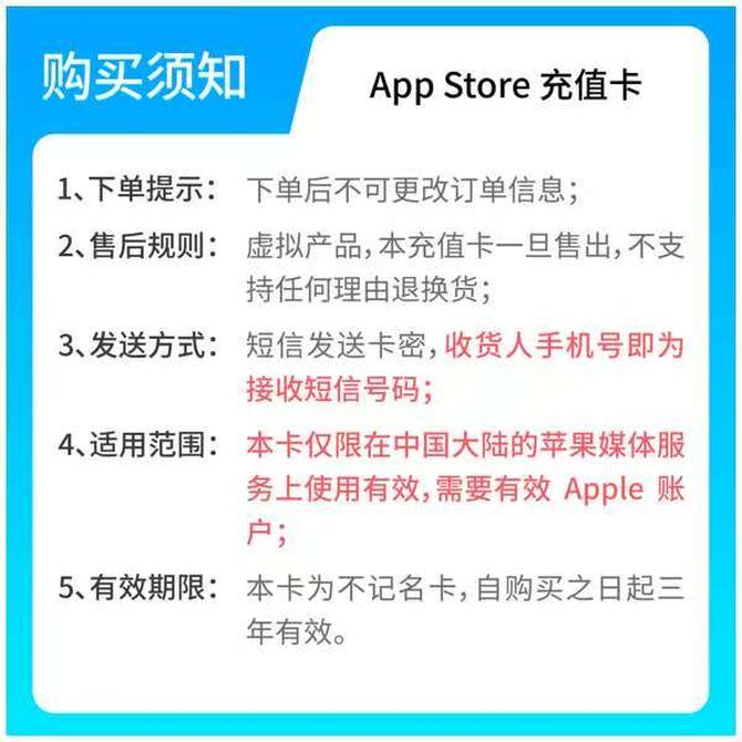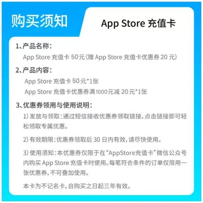 APP STORE 充值卡 50元(赠 App Store 充值卡优惠券 20元);充值卡有效期3年 赠优惠券满1000元可用;短信发送卡密及优惠券,点击自动兑换可完成卡密兑换,以及领取优惠券;优惠券30日内有效 兑换价格 2600 里程 会员卡别 终身白金卡 白金卡 金卡 银卡 普通卡 儿童卡 服务 由 迈核科技 发货并提供售后 卡券规格: 套票 购买数量: 件 库存件 立即购买 成功添加到购物车 关闭 购物车共有 种商品 总金额为: