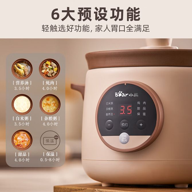 小熊/Bear 电炖锅 紫砂锅电砂锅 1.5L 天然紫砂内胆DDG-E15H1 六大功能 智控面板 兑换价格 4800 里程 会员卡别 终身白金卡 白金卡 金卡 银卡 普通卡 儿童卡 服务 由 鑫城家电 发货并提供售后 颜色: 其他 购买数量: 件 库存件 配送地址: 立即购买 加入购物车 成功添加到购物车 关闭 购物车共有 种商品 总金额为: 组合销售 产品介绍 产品规格 售后服务 产品咨询 发现好货 小熊/Bear 电炖锅1-2人小炖锅煮粥锅智能预约定时煲汤锅炖汤锅燕窝炖盅 4400 里程 西屋/Westinghouse 多功能电煮锅电炖锅1.6L一锅多能WFB16A 11600 里程 苏泊尔(SUPOR) 电火锅家用不粘煎涮炖煮多功能4L大容量一体式大火力电煮锅不粘煎涮炖煮多功能料理锅 H40YK757 5700 里程 小熊(Bear)电炖锅电炖盅煮粥神器煲汤锅炖汤锅婴儿煮粥锅熬粥燕窝炖盅DDG-E15K2 4800 里程 利仁(Liven)电炒锅电煮锅电火锅 家用多功能小电锅电炖锅宿舍泡面锅 4.5L容量 DHG-X451 5200 里程