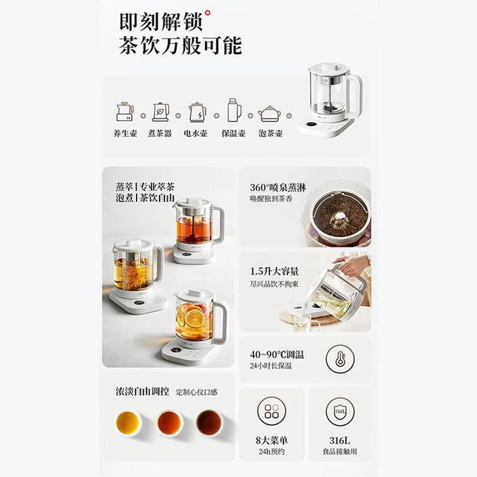 组合销售 产品介绍 产品规格 售后服务 产品咨询 发现好货 九阳/Joyoung 养生壶1.5L茶具电茶壶煮茶壶花茶壶玻璃煮茶器煎药壶中药锅药膳电水壶烧水壶 3900 里程 九阳/Joyoung 养生壶迷你玻璃花茶壶煮茶器 12大功能11档温度 电水壶热水壶烧水壶 1.5L DGD1506BQ 3900 里程 美的/Midea 养生壶 1.5L家用多功能小型全自动办公室烧水壶加厚玻璃煮茶热水壶 MK-YS15P201 4200 里程 美的/Midea 养生壶 1.5L家用养生壶全自动玻璃烧水壶24h预约烧水壶12小时防干烧保护智能恒温 MK-YS15P202 3700 里程 美的/Midea 养生壶 1.5L全自动电热水壶 24h预约12小时智能恒温 14大功能11档控温 花茶壶煮茶器MK-Y12Q 3500 里程