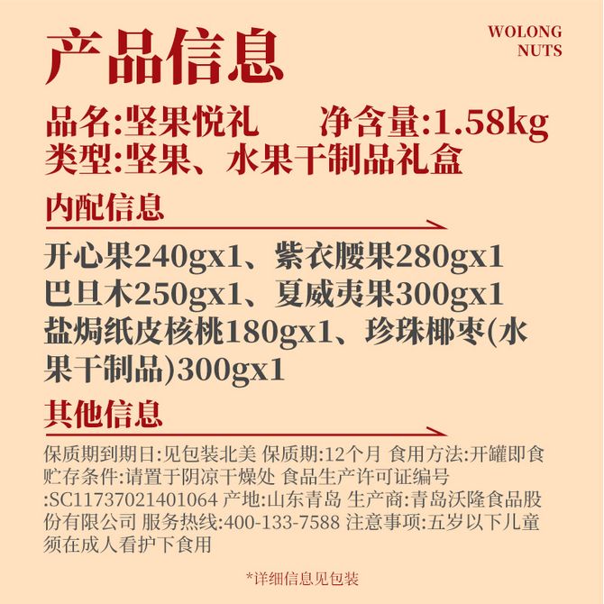 内配:开心果 240g*1罐 紫衣腰果 280g*1罐 巴旦木 250g*1罐 盐焗纸皮核桃 180g*1罐 夏威夷果 300g*1罐 珍珠椰枣 330g*1罐