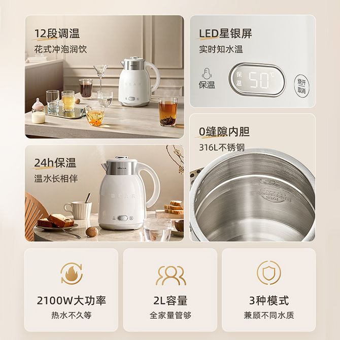 小熊/Bear 电热水壶 家用烧水壶新款热水壶恒温大容量开水壶花式冲泡润饮0缝隙内胆电水壶 12段调温 LED星银屏 实时知水温 316L不锈钢 24h保温 兑换价格 8700 里程 会员卡别 终身白金卡 白金卡 金卡 银卡 普通卡 儿童卡 服务 由 广西桂福礼供应链管理有限公司 发货并提供售后 颜色: 其他 购买数量: 件 库存件 配送地址: 立即购买 加入购物车 成功添加到购物车 关闭 购物车共有 种商品 总金额为: