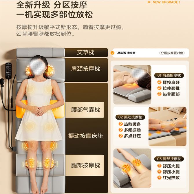 奥克斯/AUX 按摩床垫AQA-LL-C5(卡其色)五件套 奥克斯按摩靠垫按摩器全自动揉捏全身腰部背部多功能全身靠垫 兑换价格 15300 里程 会员卡别 终身白金卡 白金卡 金卡 银卡 普通卡 儿童卡 服务 由 榆康淼电器 发货并提供售后 颜色: 白色 蓝色 购买数量: 件 库存件 配送地址: 立即购买 加入购物车 成功添加到购物车 关闭 购物车共有 种商品 总金额为: 组合销售 产品介绍 产品规格 售后服务 产品咨询 发现好货 鹰伦 U型颈椎按摩仪SKT-Y8807 白色 3400 里程 亚摩斯/Amos 多功能筋膜枪 小巧轻盈携带方便智能 运动护理修复神器AS-JM256 3900 里程 践程JeoyCosy 脉冲颈椎按摩仪 热敷颈部按摩器 智能家用理疗肌肉放松健康护理肩颈护颈仪 3500 里程 奥克斯/AUX 6头筋膜枪-AJM-74A327充电款 4800 里程 SKG 筋膜枪便携按摩仪专业级筋膜枪肌肉按摩器全身颈椎肩颈腰腿运动 8700 里程