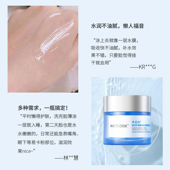 水密码/WETCODE 补水保湿免洗睡眠面膜【80g*2瓶】补水锁水深层保湿 夜间涂抹式,懒人面膜,持续保湿,柔软水润。 兑换价格 3000 里程 会员卡别 终身白金卡 白金卡 金卡 银卡 普通卡 儿童卡 服务 由 京狮文化生活馆 发货并提供售后 化妆品容量: 组合 购买数量: 件 库存件 配送地址: 立即购买 加入购物车 成功添加到购物车 关闭 购物车共有 种商品 总金额为: