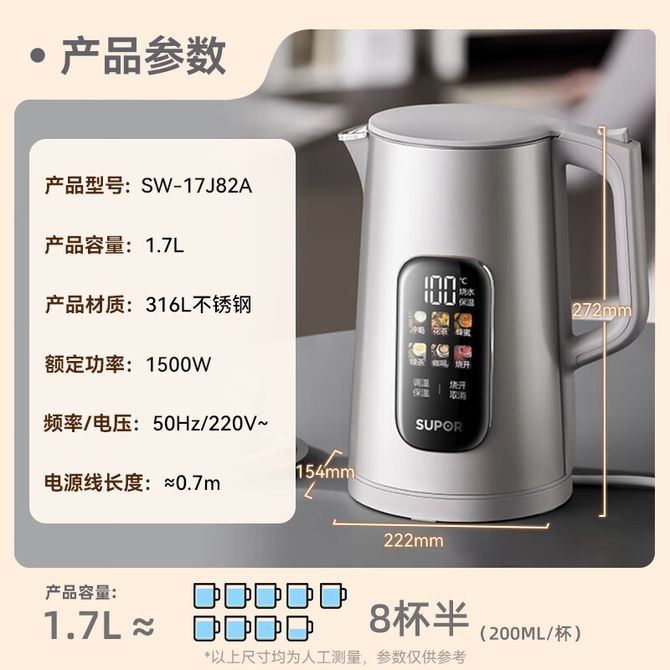 苏泊尔(SUPOR) 电热水壶SW-17J82A 大容量调温保温 恒温水壶 大彩屏实时显温烧水壶 316L不锈钢电水壶1.7L 大容量调温保温 恒温水壶 大彩屏实时显温烧水壶 316L不锈钢电水壶1.7L 兑换价格 17200 里程 会员卡别 终身白金卡 白金卡 金卡 银卡 普通卡 儿童卡 服务 由 纳华优选 发货并提供售后 颜色: 灰色 购买数量: 件 库存件 配送地址: 立即购买 加入购物车 成功添加到购物车 关闭 购物车共有 种商品 总金额为:
