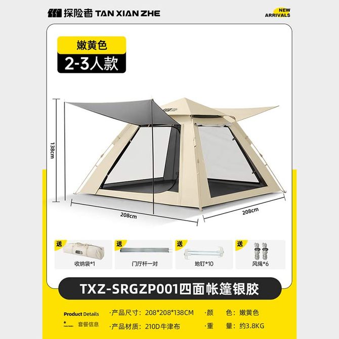 探险者(TAN XIAN ZHE) 帐篷 户外便携式折叠露营装备全自动帐篷 银胶速开帐篷 (208*208*138cm) 展开尺寸:208*208*138cm 材质:210D涂银牛津布 兑换价格 10900 里程 会员卡别 终身白金卡 白金卡 金卡 银卡 普通卡 儿童卡 服务 由 亿宇安百户外专营店 发货并提供售后 颜色: 其他 购买数量: 件 库存件 配送地址: 立即购买 加入购物车 成功添加到购物车 关闭 购物车共有 种商品 总金额为: 组合销售 产品介绍 产品规格 售后服务 产品咨询 发现好货 北山狼/BSWolf 户外月亮椅露营折叠椅便携式野餐沙滩休闲躺椅 卡其色-成人款 2600 里程 徽羚羊 帐篷防雨布天幕户外遮阳超轻便携大凉棚野露营防雨遮阳棚 300*295CM 5000 里程 创悦(CREAJOY)便携式帐篷 2-3人室内外露营遮阳帐篷 200*150*115cm CY-5800蓝色 5300 里程 探险者(TAN XIAN ZHE) 帐篷 户外便携式折叠露营装备全自动帐篷 3-4人银胶速开帐篷 (200*145*120cm) 8500 里程 创悦(CREAJOY)全自动帐篷 2-3人野营露营免安装速开帐篷 200*150*135cm CY-5905A 绿色 8700 里程
