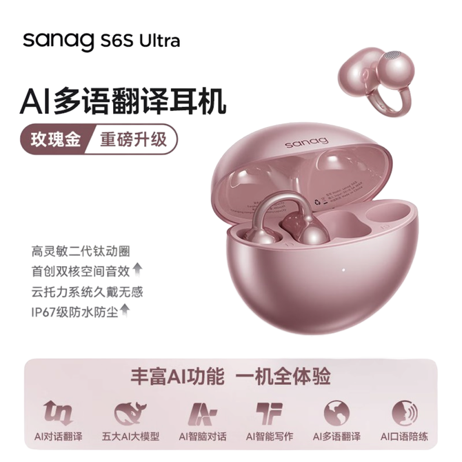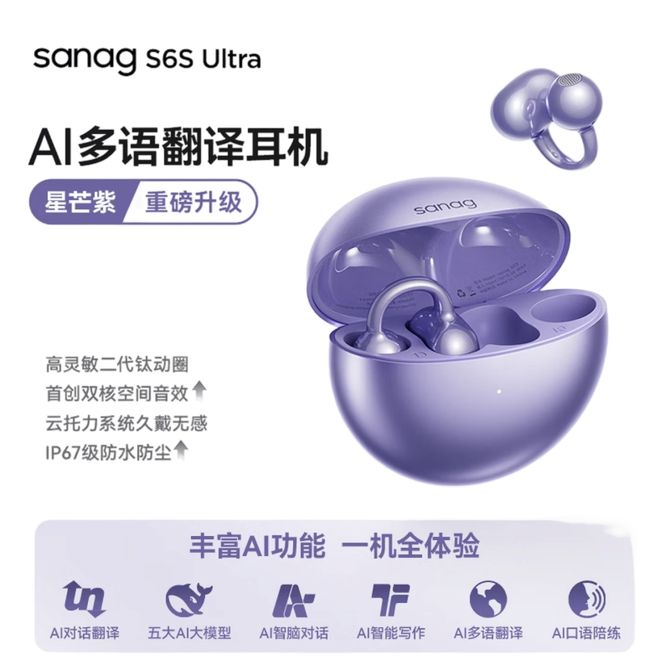 sanag S6S Ultra耳夹式AI蓝牙耳机 AI翻译写作对话 华为小米苹果手机通用 原装正品,1年质保 兑换价格 17400 里程 会员卡别 终身白金卡 白金卡 金卡 银卡 普通卡 儿童卡 服务 由 会天伦3C专营店 发货并提供售后 颜色: 白色 黑色 金色 紫色 粉色 购买数量: 件 库存件 配送地址: 立即购买 加入购物车 成功添加到购物车 关闭 购物车共有 种商品 总金额为: