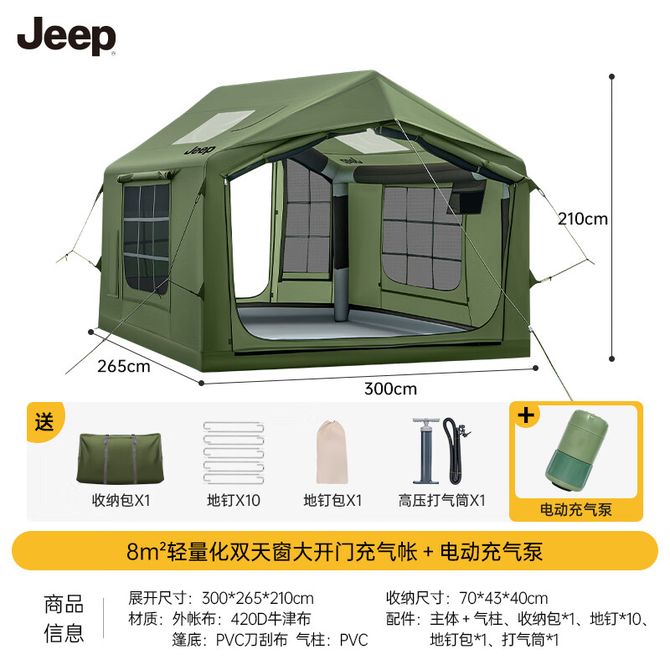 Jeep 8M²户外露营充气帐篷(电动充气款) 8M²大空间、配电动充气泵 兑换价格 104000 里程 会员卡别 终身白金卡 白金卡 金卡 银卡 普通卡 儿童卡 服务 由 至恩户外运动专营店 发货并提供售后 颜色: 绿色 购买数量: 件 库存件 配送地址: 立即购买 加入购物车 成功添加到购物车 关闭 购物车共有 种商品 总金额为: 组合销售 产品介绍 产品规格 售后服务 产品咨询 发现好货 北山狼/BSWolf 户外月亮椅露营折叠椅便携式野餐沙滩休闲躺椅 卡其色-成人款 2600 里程 徽羚羊 帐篷防雨布天幕户外遮阳超轻便携大凉棚野露营防雨遮阳棚 300*295CM 5000 里程 创悦(CREAJOY)便携式帐篷 2-3人室内外露营遮阳帐篷 200*150*115cm CY-5800蓝色 5300 里程 探险者(TAN XIAN ZHE) 帐篷 户外便携式折叠露营装备全自动帐篷 3-4人银胶速开帐篷 (200*145*120cm) 8500 里程 创悦(CREAJOY)全自动帐篷 2-3人野营露营免安装速开帐篷 200*150*135cm CY-5905A 绿色 8700 里程
