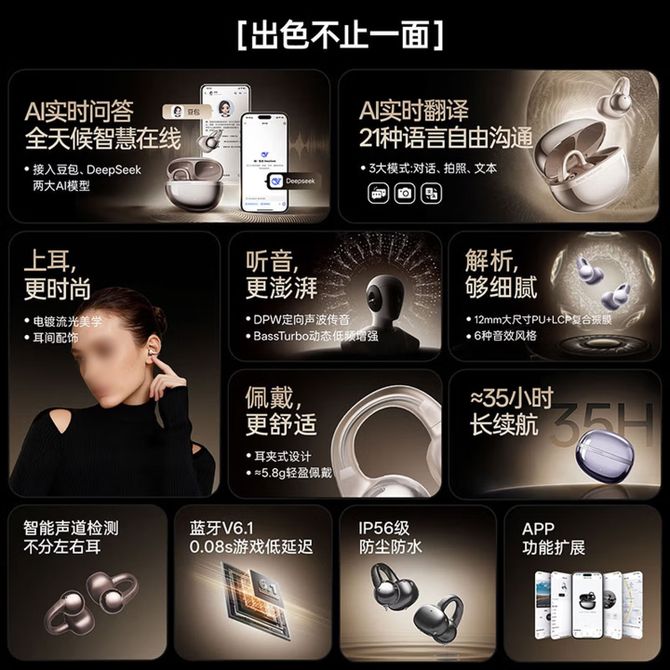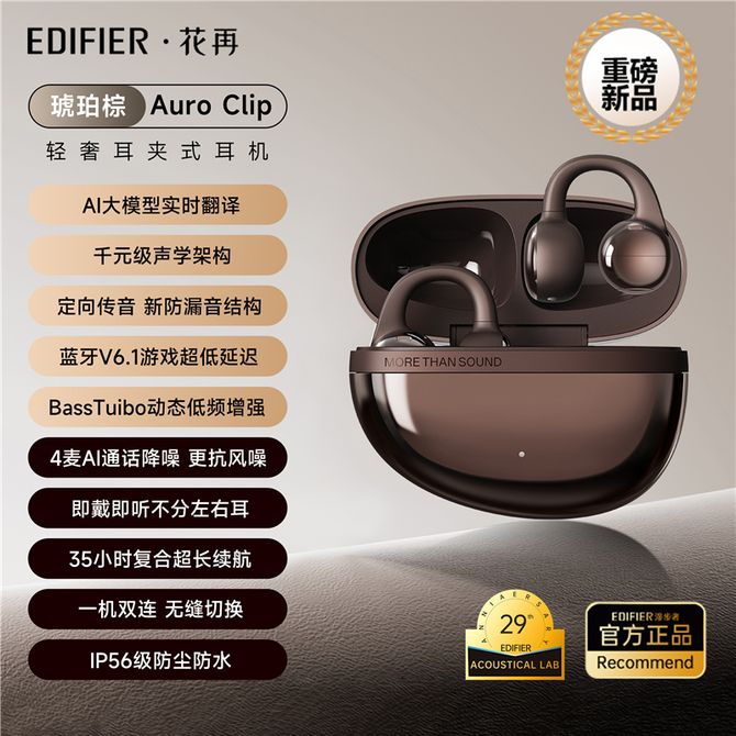 漫步者/EDIFIER 耳夹开放式蓝牙耳机 镜面流光HiFi音质耳麦无线Auro Clip AI实时翻译 轻奢电镀工艺,流光溢彩效果,大口径复合振膜,HiFi音质,定向传声,多种音效,强效续航,全新蓝牙6.1,AI实时翻译,高清通话AI降噪,IP56级防尘防水 兑换价格 17000 里程 会员卡别 终身白金卡 白金卡 金卡 银卡 普通卡 儿童卡 服务 由 智科精品 发货并提供售后 颜色: 紫罗兰色 摩卡棕 购买数量: 件 库存件 配送地址: 立即购买 加入购物车 成功添加到购物车 关闭 购物车共有 种商品 总金额为: