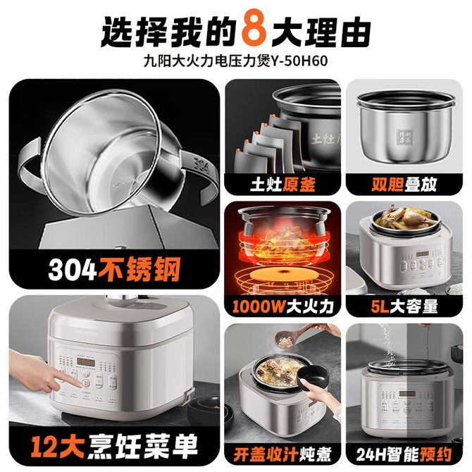 九阳/Joyoung 电压力锅5L多功能压力煲上盖可拆卸Y-50H60 钢釜胆/铁釜胆 兑换价格 19000 里程 会员卡别 终身白金卡 白金卡 金卡 银卡 普通卡 儿童卡 服务 由 鑫城家电 发货并提供售后 颜色: 其他 购买数量: 件 库存件 配送地址: 立即购买 加入购物车 成功添加到购物车 关闭 购物车共有 种商品 总金额为: 组合销售 产品介绍 产品规格 售后服务 产品咨询 发现好货 苏泊尔(SUPOR)电压力锅 6升大容量 智能触控 球釜双胆 开盖收汁 一键排压 SY-60YC8001Q 高压锅 16900 里程 美的/Midea 电压力锅家用5L大容量多功能高压锅双胆一键收汁智能预约不粘电高压锅电饭锅煮粥煲汤锅 一锅双胆【一键收汁入味】 YL50M1-702 10600 里程 苏泊尔(SUPOR) 5L电压力锅家用电高压锅双胆高压电饭锅煮饭智能预约 SY-50YC8186 11300 里程 美的/Midea 电压力锅 【一锅双胆】5L全自动家用智能预约 上蒸下煮 不粘双胆煲汤炖肉 YL50Q3-451 10900 里程 美的/Midea 电压力锅 高压锅家用电压力煲智能预约电饭煲大容量多功能定时预约电饭煲3-8人单胆旋钮款4L MY-E4809 8700 里程