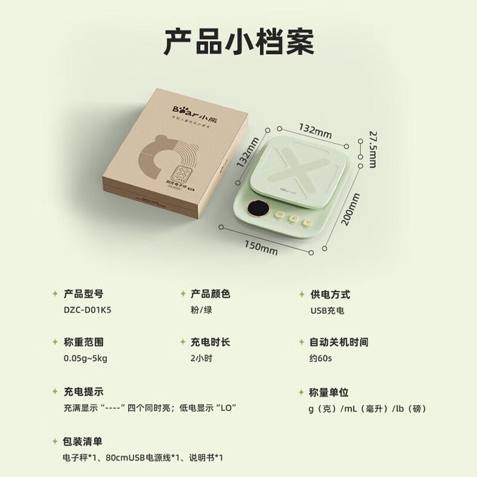 小熊/Bear 厨房电子秤电子秤食物秤烘焙称克数秤厨房克秤 DZC-D01K5 充电款 兑换价格 3400 里程 会员卡别 终身白金卡 白金卡 金卡 银卡 普通卡 儿童卡 服务 由 鑫城家电 发货并提供售后 颜色: 其他 购买数量: 件 库存件 配送地址: 立即购买 加入购物车 成功添加到购物车 关闭 购物车共有 种商品 总金额为: 组合销售 产品介绍 产品规格 售后服务 产品咨询 发现好货 奥克斯/AUX 体重秤体脂称 3001W1M 充电款 2000 里程 小米体重秤2 家用健康秤电子秤 高精度智能分析隐藏式LED屏幕 4400 里程 小米 智能体重秤S200 米家家用健康秤电子秤 高精度 人物双模式 APP数据测量 智能分析 3900 里程 小米 家用健康秤电子秤高精度 人物双模式 APP数据测量智能体重秤S200白色 3900 里程 小熊/Bear 厨房秤高精度0.05g充电款 家用电子秤 厨房克秤 迷你食物称DZCD01K5绿色 3500 里程